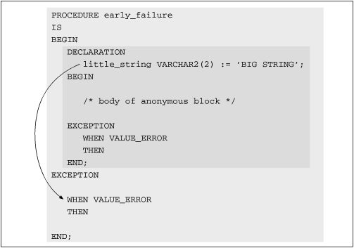 The assignment of the default value to little_string is too big for the variable. This causes PL/SQL to raise the VALUE_ERROR exception. This exception will not, however, be handled by the VALUE_ERROR handler in the anonymous block's exception section. Instead, PL/SQL will terminate the anonymous block and try to handle the exception in early_failure's exception section.