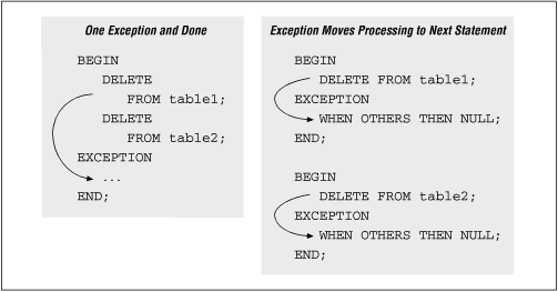 When an exception is raised in a PL/SQL block, normal execution is halted and control is transferred to the exception section. "You can never go home again," and you can never return to the execution section once an exception is raised in that block. In some cases, however, the ability to continue past exceptions is exactly the desired behavior.