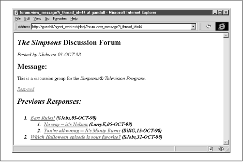Our second, more complex example allows users to post messages in a browser-based threaded discussion forum. The granddaddy of all discussion lists, Usenet, allows the Internet community to share its views on literally thousands of topics, ranging from C programming to The X-Files. A more focused list, run by RevealNet at http://www.revealnet.com, is geared to PL/SQL developers.