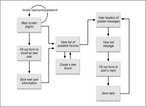The leftmost portion of the storyboard lays out how users log in to the system. By referring back to the diagram, we can see that we need at least three procedures in the specification: a procedure to create the login form itself (login_form); one to enroll new users (create_user_form); and one to insert the new user's information into the MEMBERS table (save_user_info). Since HTTP is a stateless protocol, we'll also need a function to pass the user's login name to the package that implements the discussion list code. This function is named get_current_user.