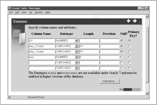 TIP: The database objects you create in WebDB are normal database objects; the wizard is simply filling in the different pieces of a SQL statement for you. If you're developing an application you can bypass the wizard entirely and create objects in SQL*Plus, Enterprise Manager, or any other tool. The "Object Wizards" option comes in handy, though, when you're off-site and can't get a SQL*Net connection.