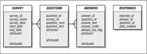 Figure 8.3 shows a data model that uses these four tables. The SURVEY table contains information about the survey itself, such as its name, description, and the date range during which it is available. The rows in QUESTIONS represent the individual questions on a survey. ANSWERS defines the list of valid responses for each question. The final table, RESPONSES, holds the actual responses given by the respondents.