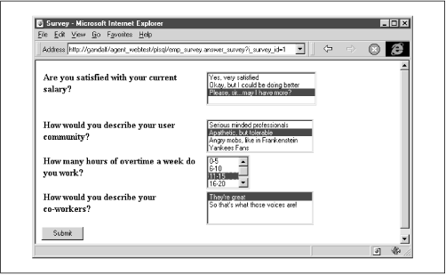 Developing the anonymous survey has taught us several things about web development. First, we have seen that a storyboard is a good place to start when faced with a new application. We can use the information on our diagram to define how the user will navigate, get a good idea of the database tables we'll need, and get a jump-start on defining the package specification. Second, this example has illustrated how to use parameter arrays to pass multiple field values, as well as how (and under what circumstances) you should use hidden fields. We'll expand these ideas further in the next sample application.